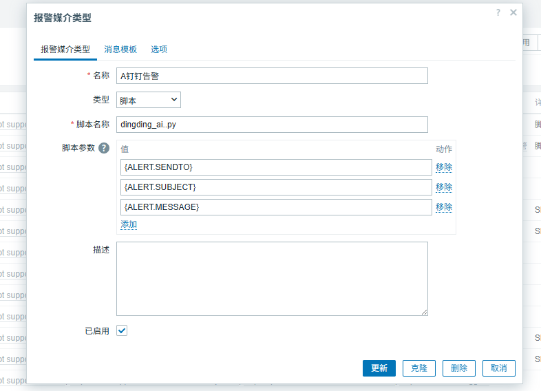 - 告警 → 媒介 → 创建媒介类型