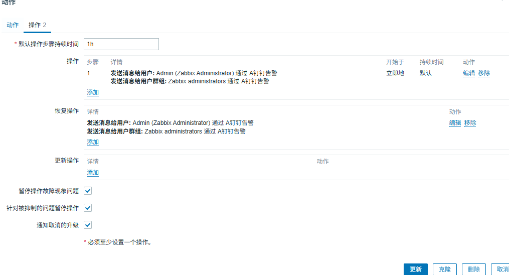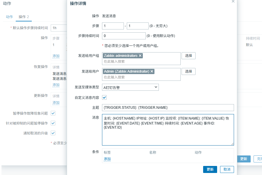 主题:{TRIGGER.STATUS}: {TRIGGER.NAME} 消息:主机: {HOST.NAME} IP地址: {HOST.IP} 监控项: {ITEM.NAME}: {ITEM.VALUE} 恢复时间: {EVENT.DATE} {EVENT.TIME} 持续时间: {EVENT.AGE} 事件ID: {EVENT.ID} ##注意!!!消息内容不要分行,否则钉钉告警时模版会乱