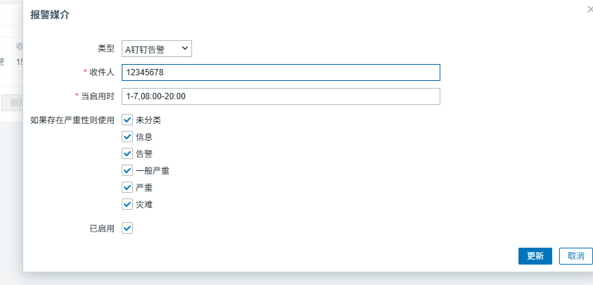 - 类型:选择告警媒介→ A钉钉告警