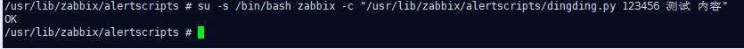 su -s /bin/bash zabbix -c "/usr/lib/zabbix/alertscripts/dingding_ai.py 123456 测试 内容"